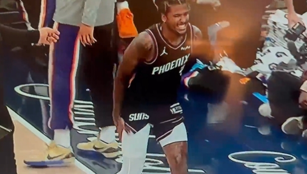 Vết thương rất nghiêm trọng! Jaylen Green nhăn mặt vì đau và không dám dùng lực nào vào chân phải.
