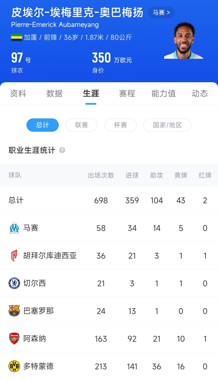 Giá chuyển nhượng hiện tại của Aubameyang 36 tuổi là 3,5 triệu euro. Ở thời kỳ đỉnh cao vào năm 2018, Aubameyang từng chơi cho Arsenal được định giá tối đa là 75 triệu euro.