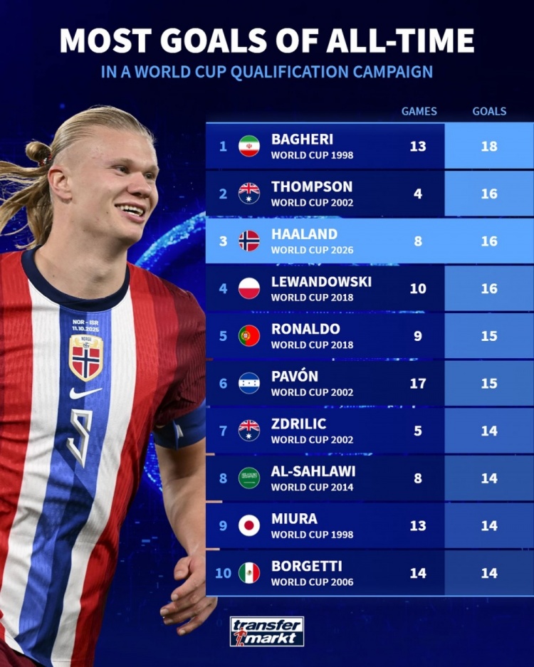 Thị trường chuyển nhượng ở Đức tính số bàn thắng do các cầu thủ ghi được trong một vòng loại World Cup và liệt kê danh sách. Haaland đã ghi 16 bàn ở vòng sơ loại World Cup này và xếp ở vị trí thứ hai.