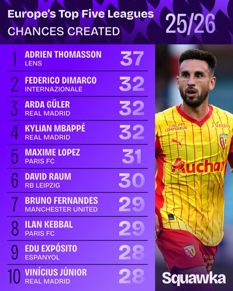 Cuộc chiến ở 5 giải đấu lớn sắp tiếp tục. Cơ quan dữ liệu squakwa cũng tính toán số cơ hội được các cầu thủ tạo ra ở 5 giải đấu lớn tính đến thời điểm hiện tại của mùa giải này. Tiền vệ của Lens, Adrian Thomason đứng đầu danh sách.