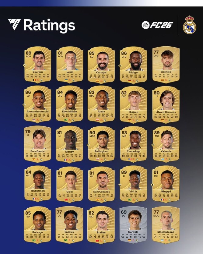 FC26 đã công bố xếp hạng người chơi Real Madrid, với MBappe có điểm cao nhất 91 điểm và Bellingham có điểm cao nhất là 90 điểm.
