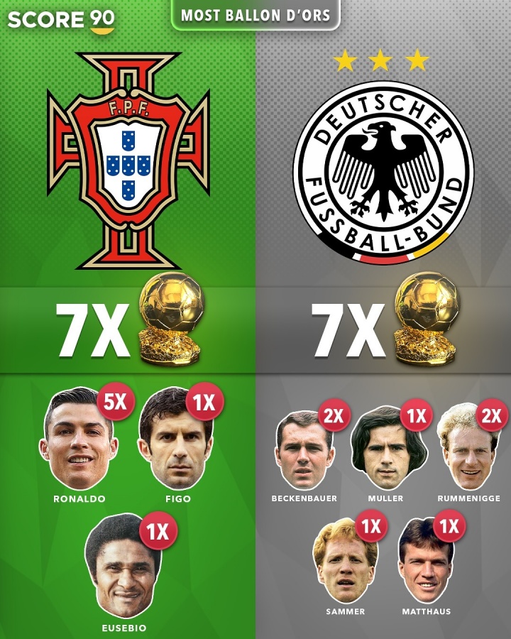 3. Bồ Đào Nha 7 lần (Royce X5 Figo, Eusibio X1)