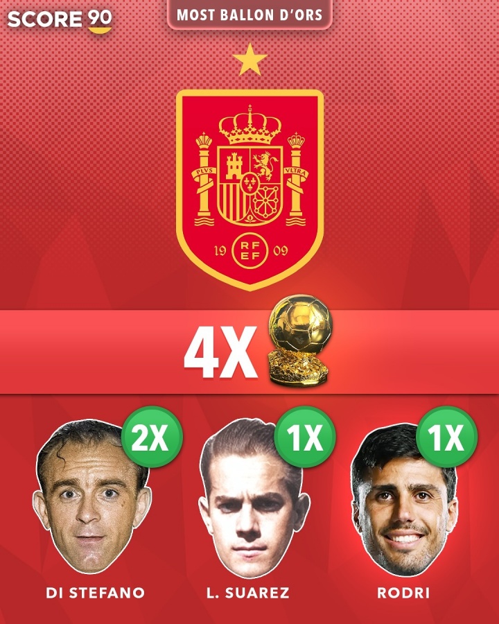 9. Tây Ban Nha 4 lần (Di Stefano, Suarez, Rodri X1)