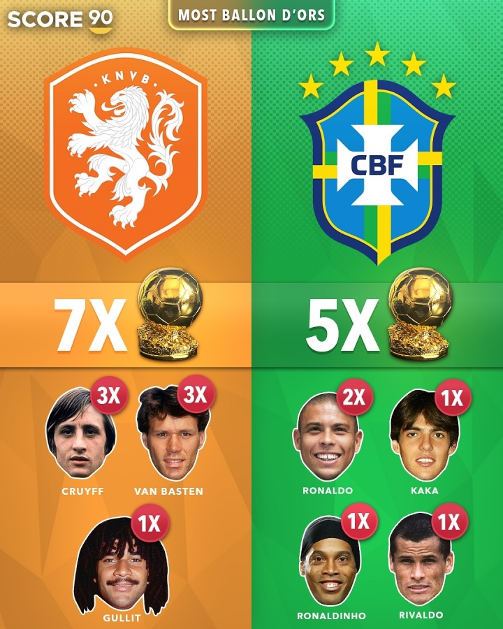 3. Hà Lan 7 lần (Cruyff, Van Basten X3 Gulit X1)